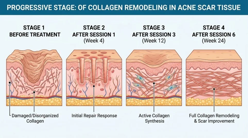 What makes acne scar treatment different from microneedling for general skin rejuvenation is that scar tissue is structurally distinct from normal skin. Acne scars involve disorganized collagen fibers, tethered tissue, and sometimes loss of volume beneath the surface. Microneedling breaks up this malformed collagen and stimulates your skin to replace it with healthier, more organized tissue. This remodeling process does not happen overnight. Collagen maturation continues for months after each session, which is why most patients need three to six treatments spaced four to six weeks apart for meaningful scar improvement.